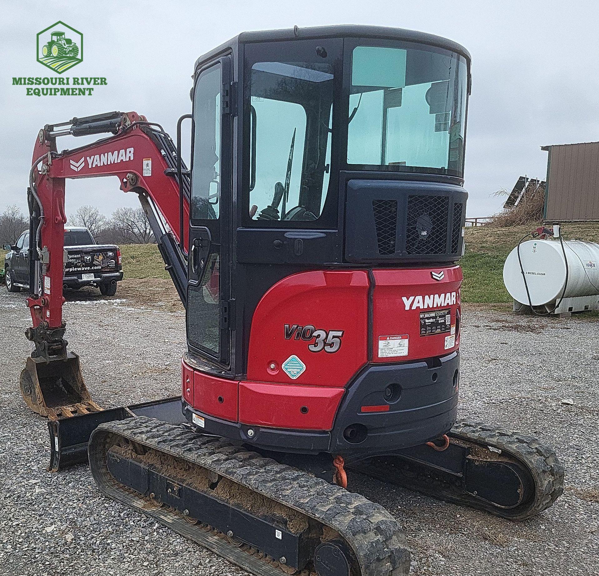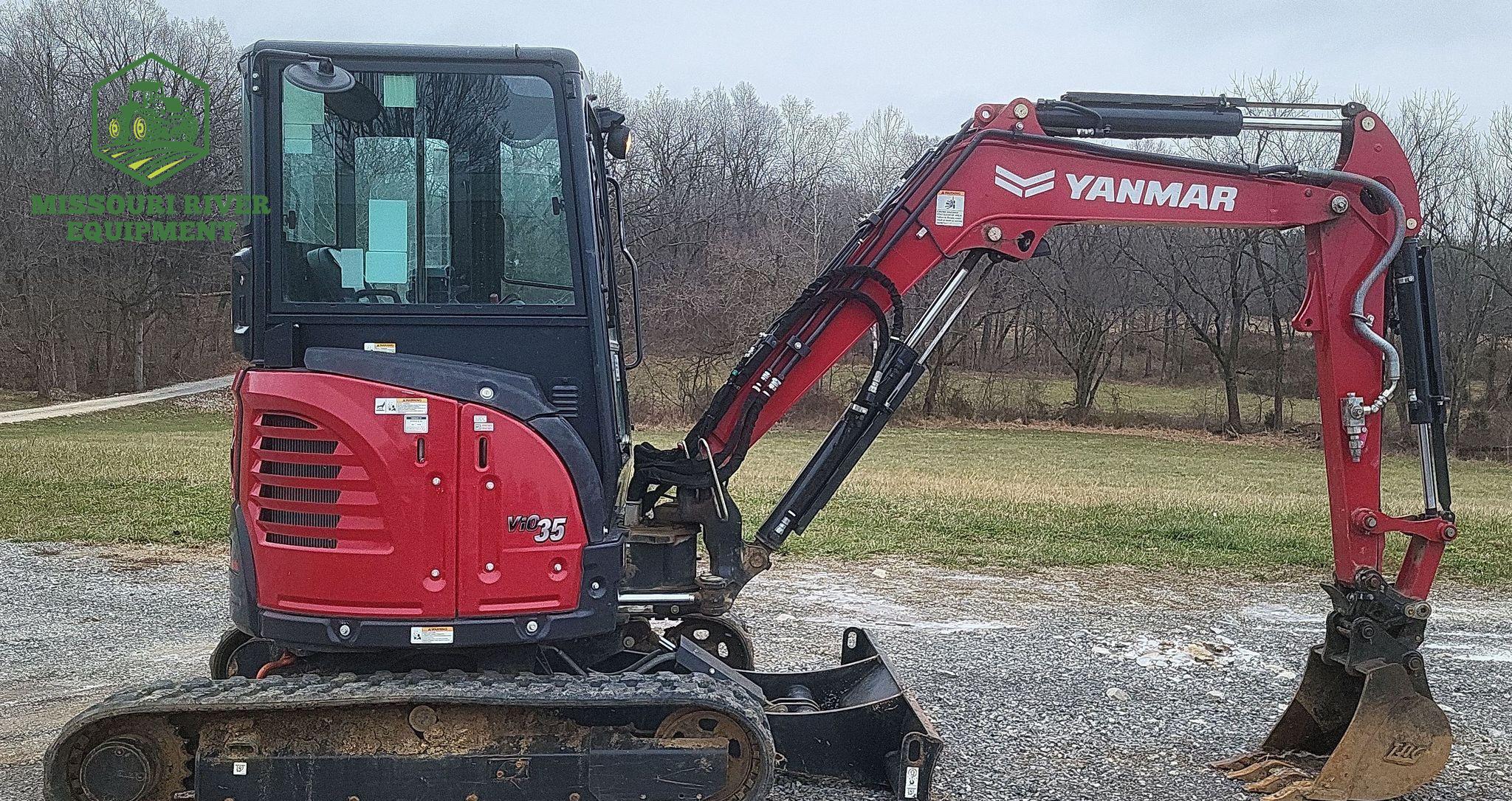 2021 Yanmar ViO35 mini excavator, 939.9 hours on meter. Equipped with a Yanmar 4HNSAE 1.642L Diesel Engine and Hydrostatic Transmission with Two-Speed Travel. Operator station features enclosed cab with AC and heat. Includes auxiliary hydraulics, counterweights, 68" backfill blade, swing boom, 4' 7" stick, and Yanmar hydraulic quick coupler. Comes with 18" TAG bucket with weld-on cutting edge and 4 teeth. Riding on 12" rubber tracks.