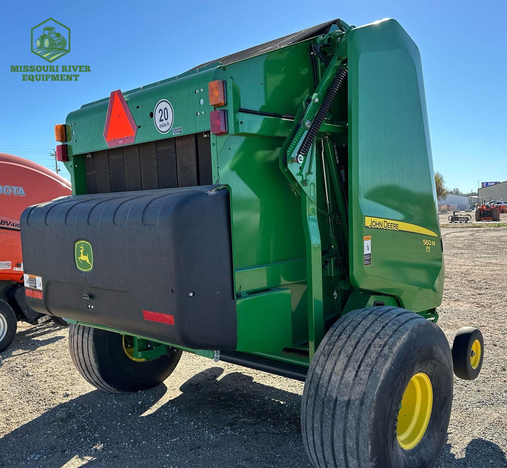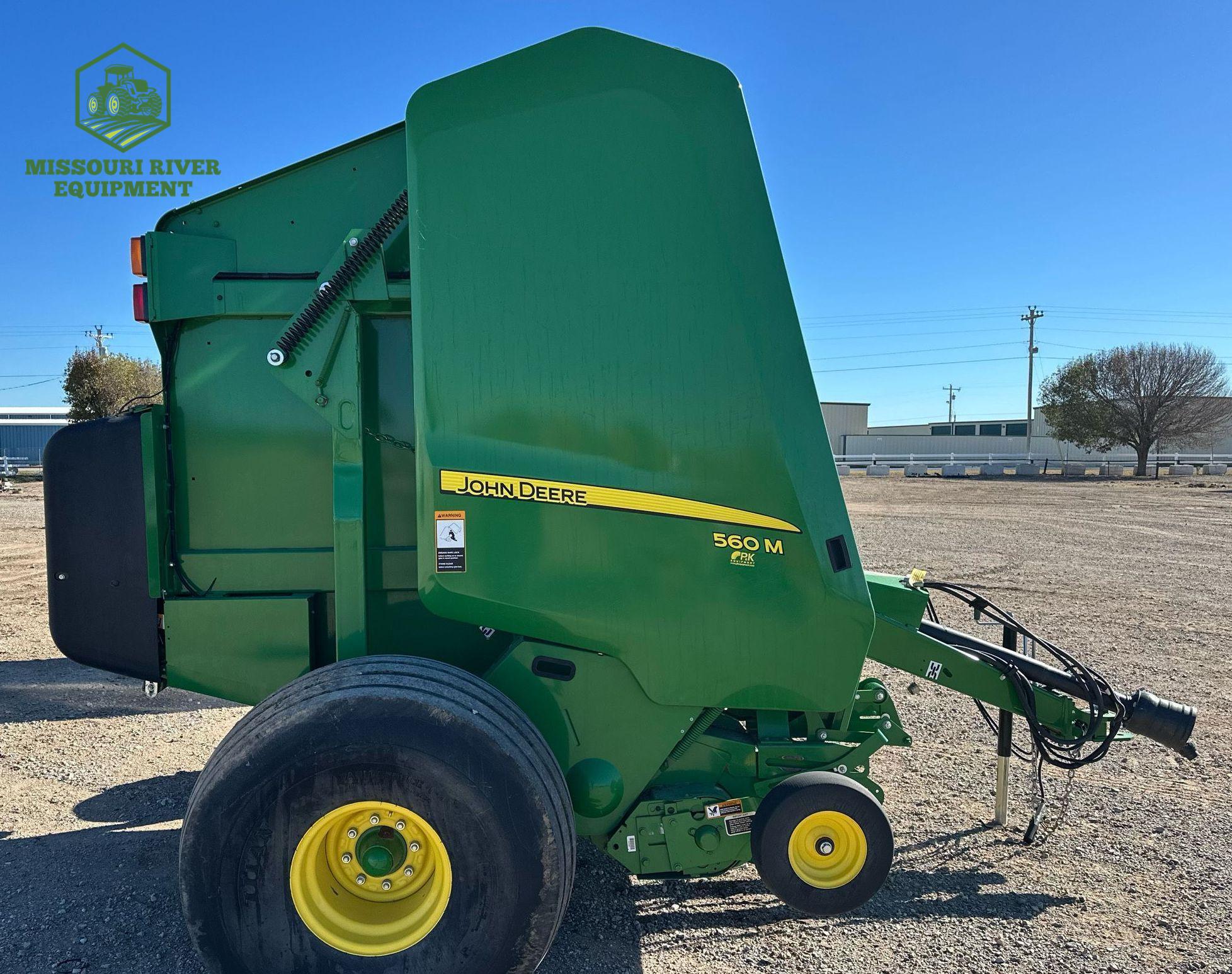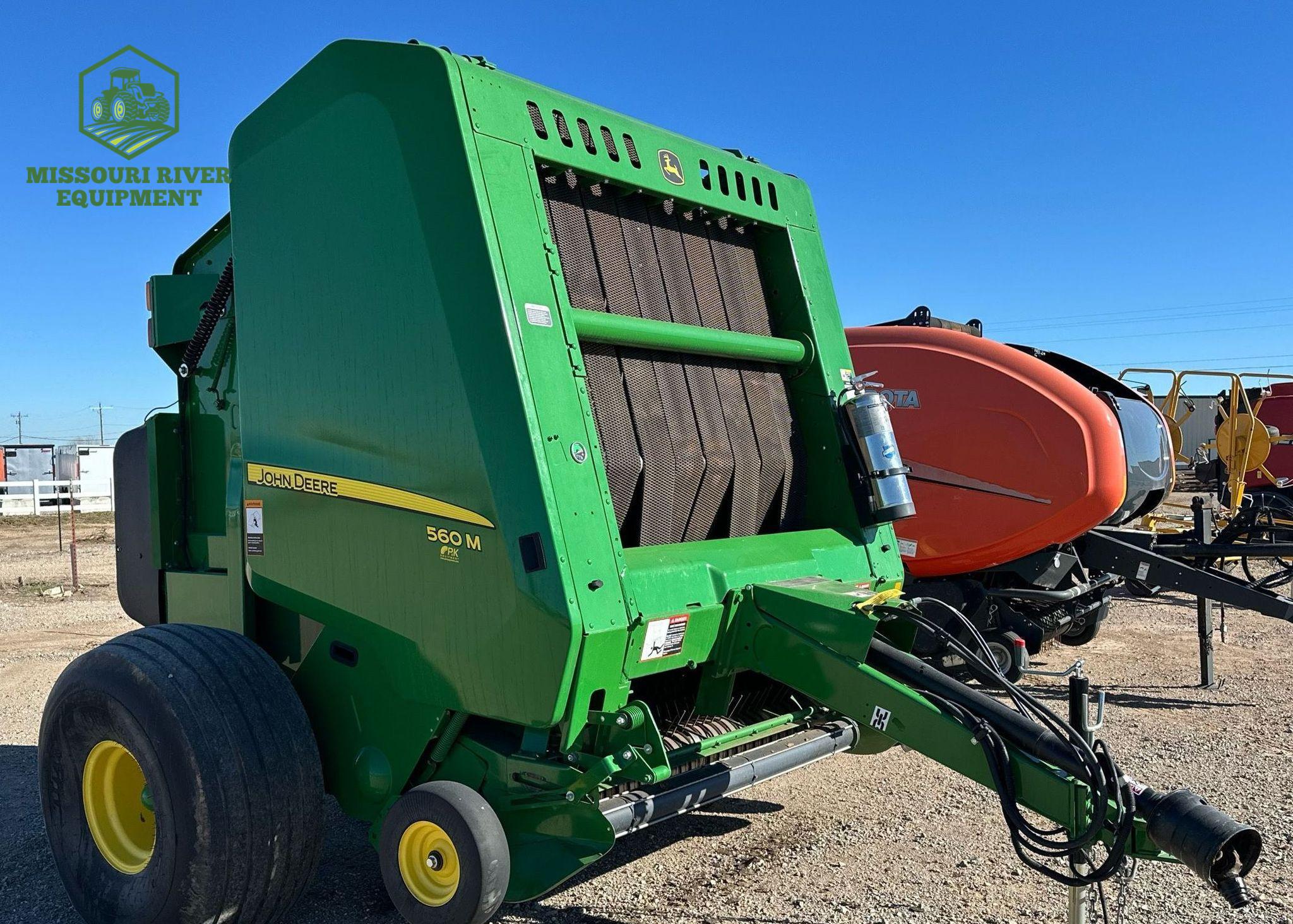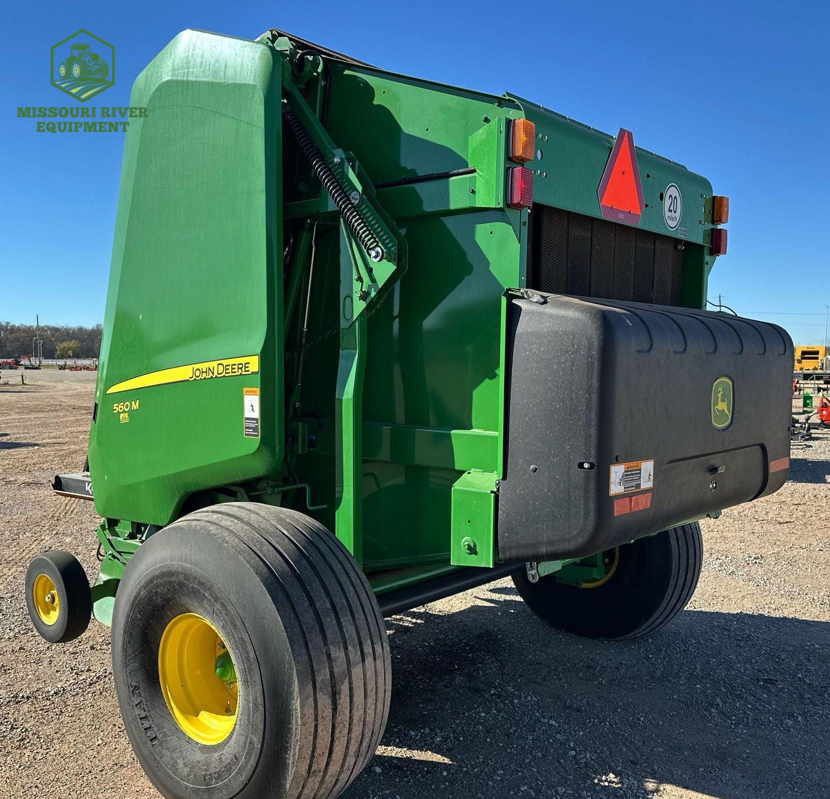 2022 John Deere 560M round baler, 4,765 bale count. Equipped with 1000 PTO, John Deere monitor, and auto lube system. Features transport lights, feed assist roller, gauge wheels (4.80-8/3.75), and 6' 6" pickup width with hydraulic pickup lift. Includes rotor cutter, auto-tie, net-wrap, and bale kicker. Produces 5' x 6' bales. Riding on 21.5L-16 tires. Tractor not included.
