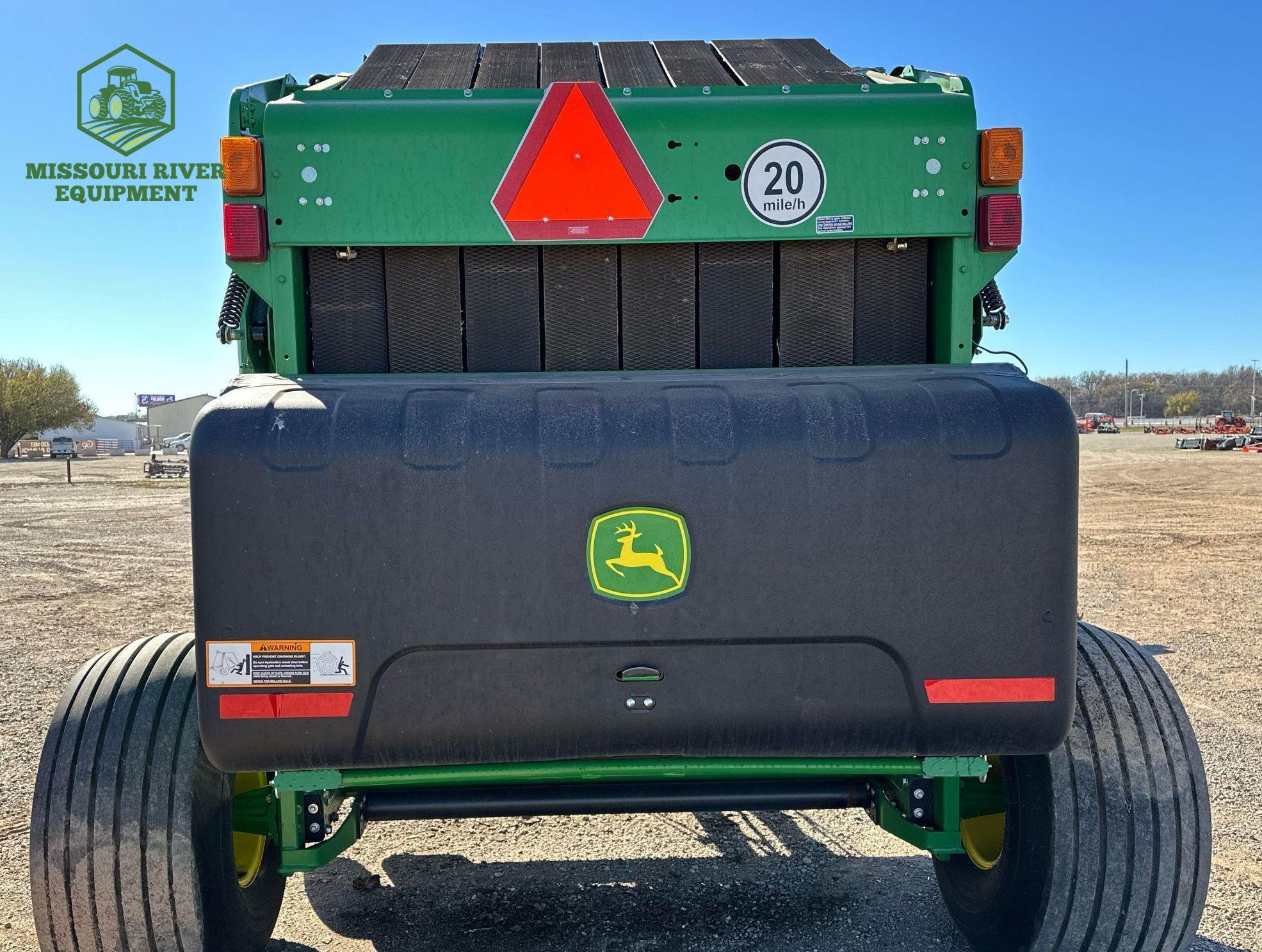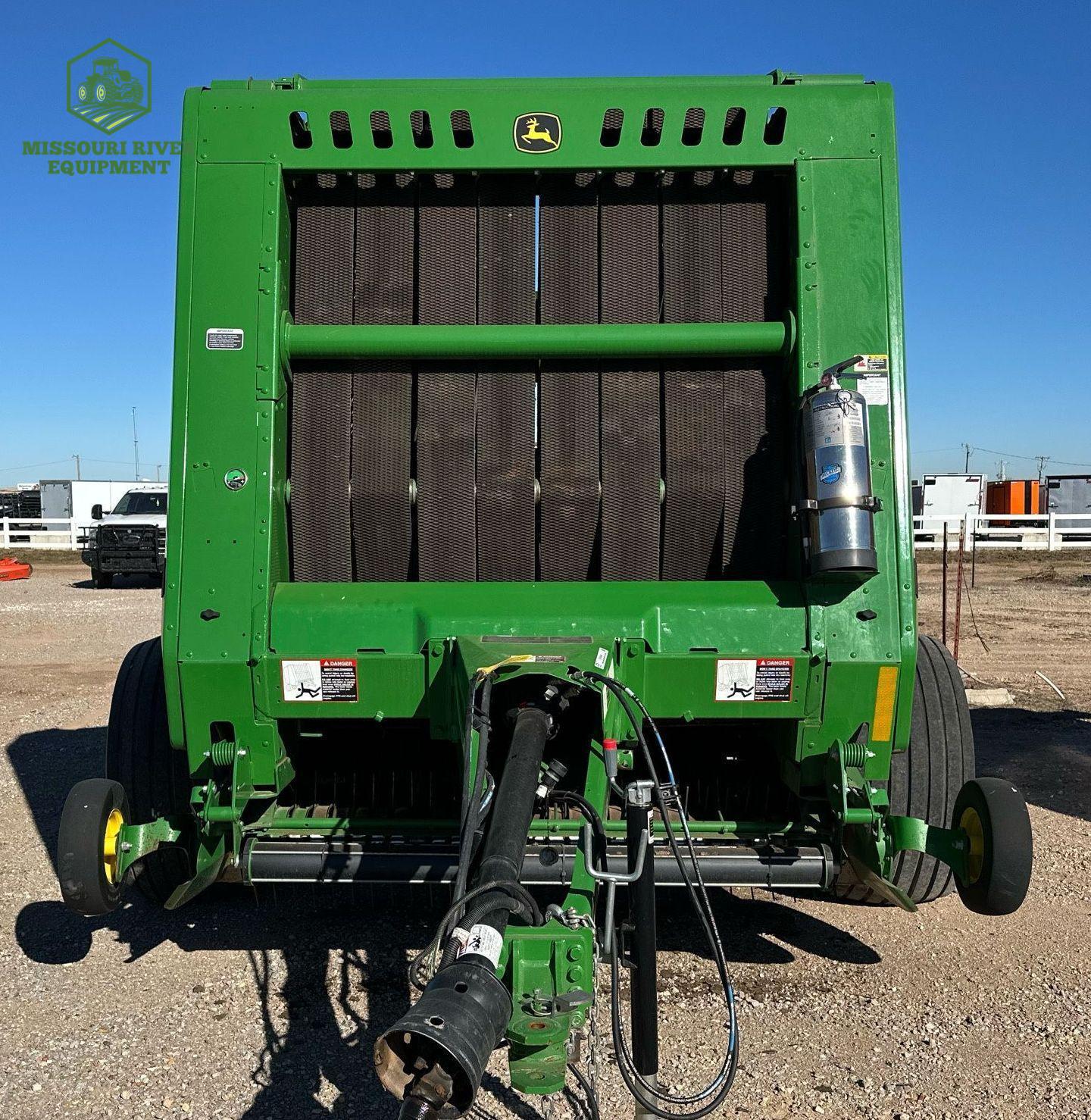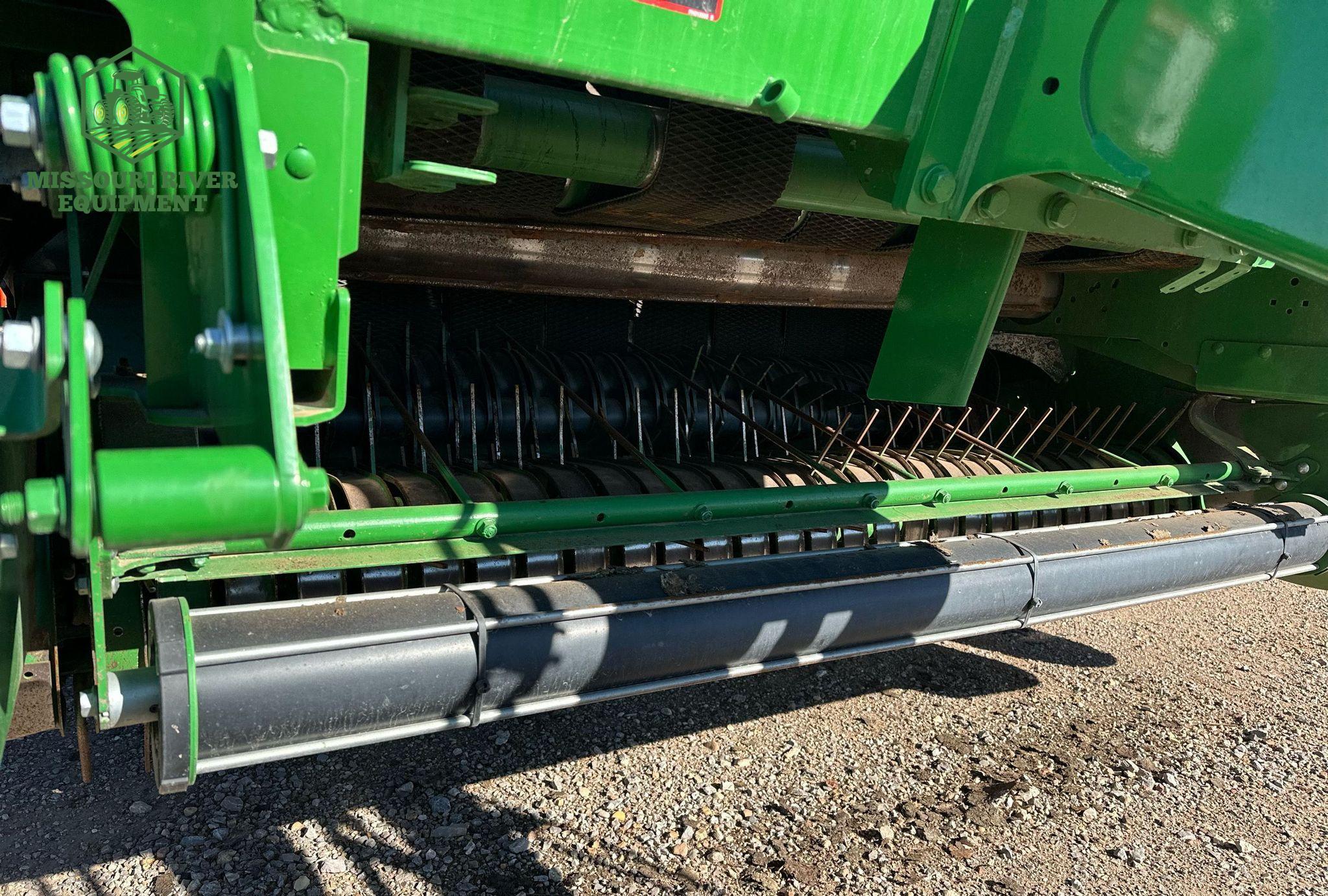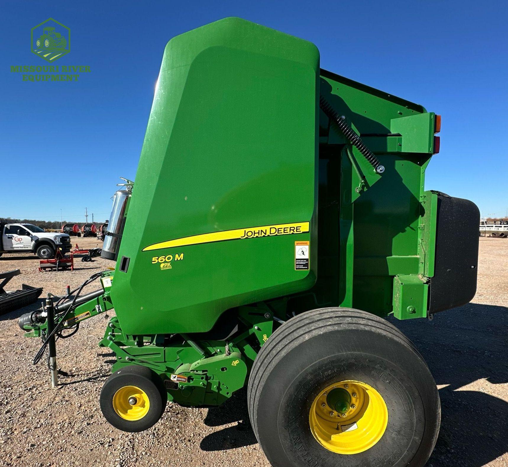 2022 John Deere 560M round baler, 4,765 bale count. Equipped with 1000 PTO, John Deere monitor, and auto lube system. Features transport lights, feed assist roller, gauge wheels (4.80-8/3.75), and 6' 6" pickup width with hydraulic pickup lift. Includes rotor cutter, auto-tie, net-wrap, and bale kicker. Produces 5' x 6' bales. Riding on 21.5L-16 tires. Tractor not included.