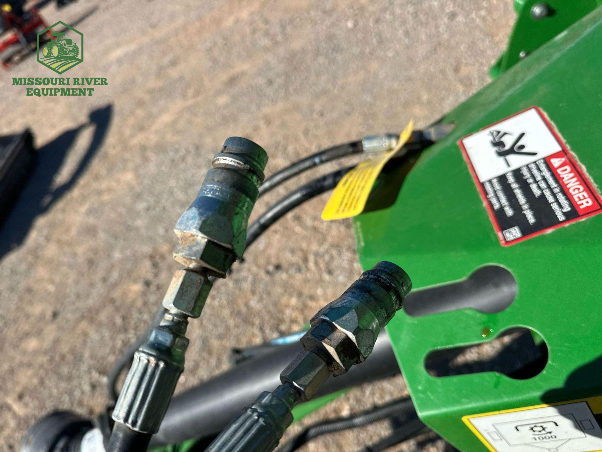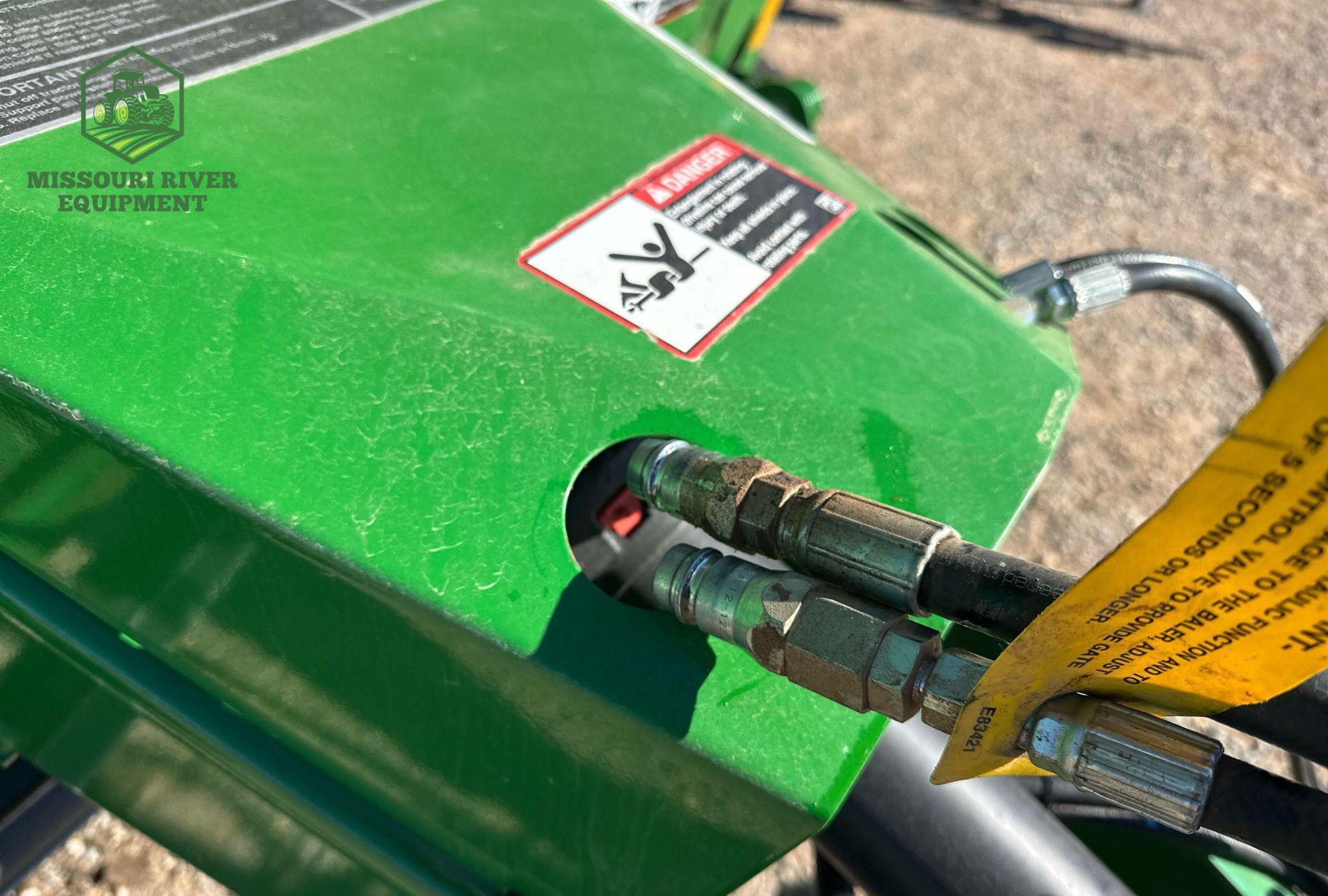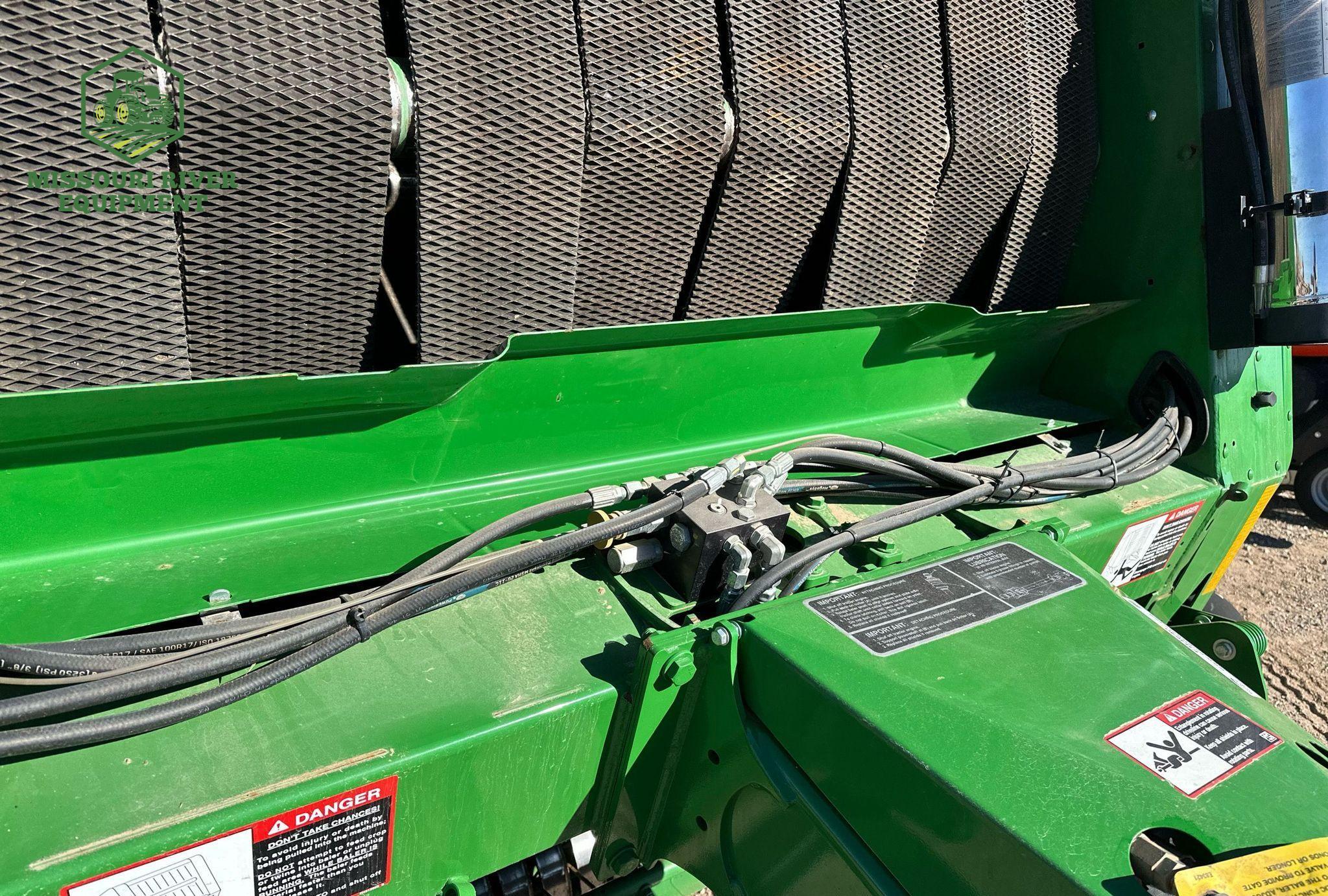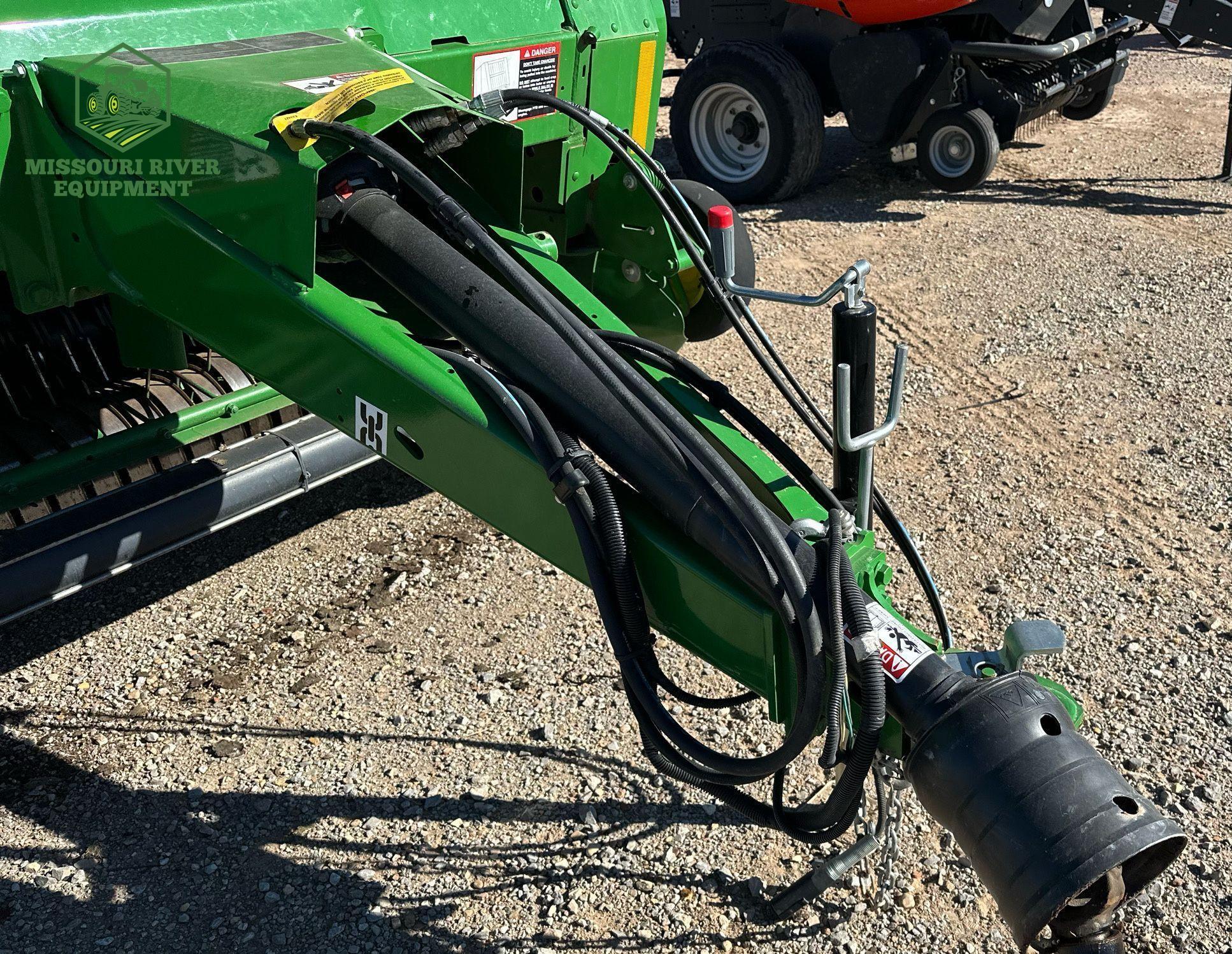 2022 John Deere 560M round baler, 4,765 bale count. Equipped with 1000 PTO, John Deere monitor, and auto lube system. Features transport lights, feed assist roller, gauge wheels (4.80-8/3.75), and 6' 6" pickup width with hydraulic pickup lift. Includes rotor cutter, auto-tie, net-wrap, and bale kicker. Produces 5' x 6' bales. Riding on 21.5L-16 tires. Tractor not included.